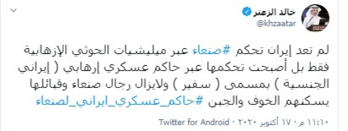 وكتب "الزعتر" تغريدة عبر تويتر، رصدها "المشهد العربي": "لم تعد إيران تحكم صنعاء عبر مليشيات الحوثي الإرهابية فقط بل أصبحت تحكمها عبر حاكم عسكري إرهابي ( إيراني الجنسية ) بمسمى ( سفير ) ولايزال رجال صنعاء وقبائلها يسكنهم الخوف والجبن".