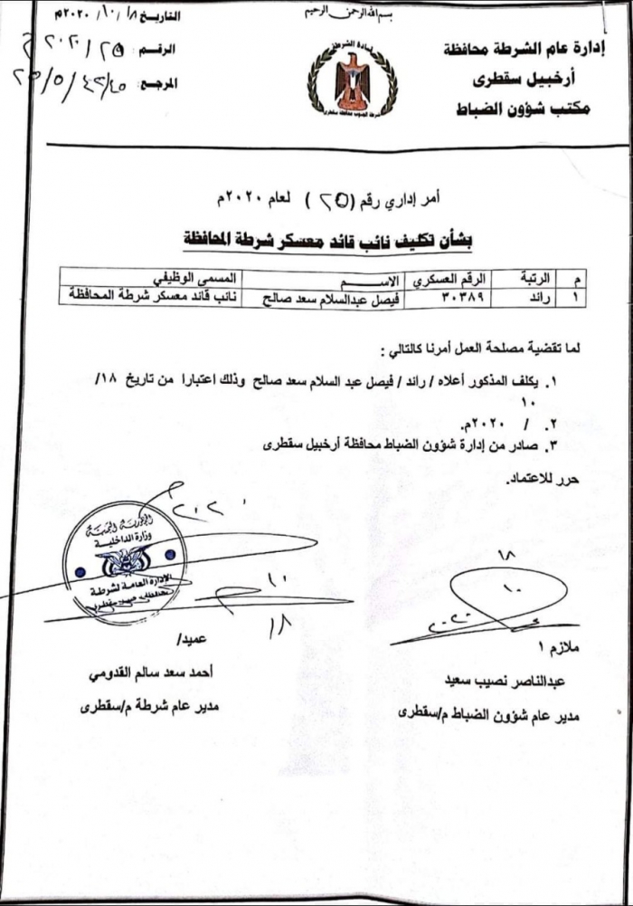 تعيين فيصل عبدالسلام نائبًا لقائد معسكر شرطة سقطرى (وثيقة)