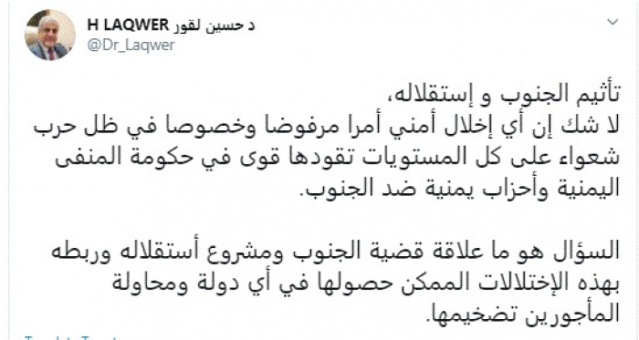 وكتب في تغريدة عبر "تويتر" رصدها "المشهد العربي": "تأثيم الجنوب واستقلاله، لا شك إن أي إخلال أمني أمرا مرفوضا وخصوصا في ظل حرب شعواء على كل المستويات تقودها قوى في حكومة المنفى اليمنية وأحزاب يمنية ضد الجنوب".