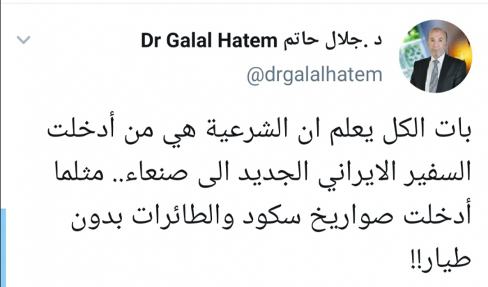 جلال حاتم: الشرعية هي من أدخلت السفير الإيراني الجديد إلى صنعاء