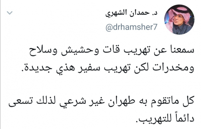 وقال الشهري في تغريدة له عبر حسابه بتويتر ورصدها "المشهد العربي": "سمعنا عن تهريب قات وحشيش وسلاح ومخدرات لكن تهريب سفير هذي جديدة".