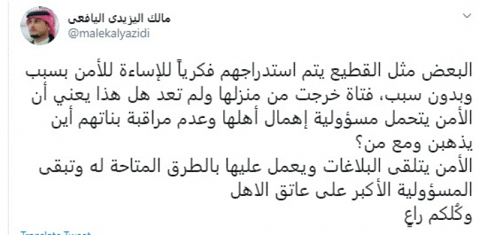 وقال في تغريدة عبر "تويتر" رصدها "المشهد العربي": "البعض مثل القطيع يتم استدراجهم فكريًا للإساءة للأمن بسبب وبدون سبب، فتاة خرجت من منزلها ولم تعد هل هذا يعني أن الأمن يتحمل مسؤولية إهمال أهلها وعدم مراقبة بناتهم أين يذهبن ومع من؟".