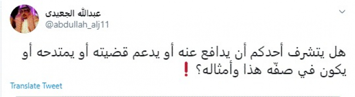 وقال في تغريدة عبر "تويتر" رصدها "المشهد العربي": "هل يتشرف أحدكم أن يدافع عنه أو يدعم قضيته أو يمتدحه أو يكون في صفّه هذا وأمثاله؟".