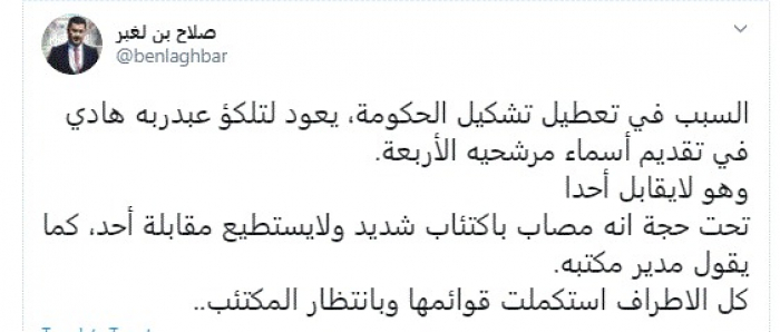 وقال في تغريدة عبر "تويتر" رصدها "المشهد العربي": "السبب في تعطيل تشكيل الحكومة، يعود لتلكؤ عبدربه هادي في تقديم أسماء مرشحيه الأربعة".