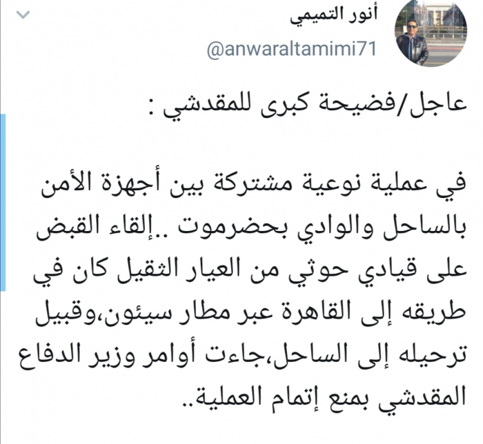 وقال التميمي عبر تغريدة له على "تويتر" رصدها " المشهد العربي": "عاجل/فضيحة كبرى للمقدشي في عملية نوعية مشتركة بين أجهزة الأمن بالساحل والوادي بحضرموت ..إلقاء القبض على قيادي حوثي من العيار الثقيل كان في طريقه إلى القاهرة عبر مطار سيئون".