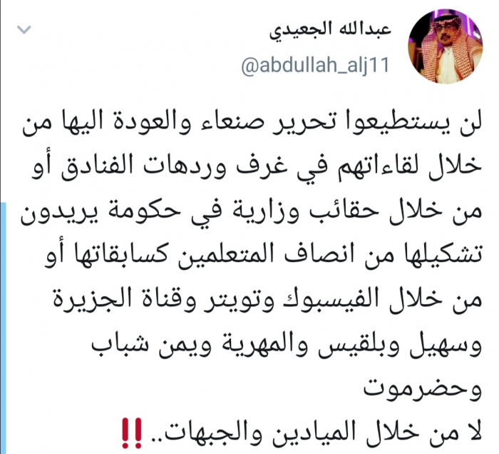 وقال الجعيدي عبر تغريدة له على "تويتر" رصدها "المشهد العربي" : "لن يستطيعوا تحرير صنعاء والعودة إليها من خلال لقاءاتهم في غرف وردهات الفنادق أو من خلال حقائب وزارية في حكومة يريدون تشكيلها من أنصاف المتعلمين كسابقاتها".