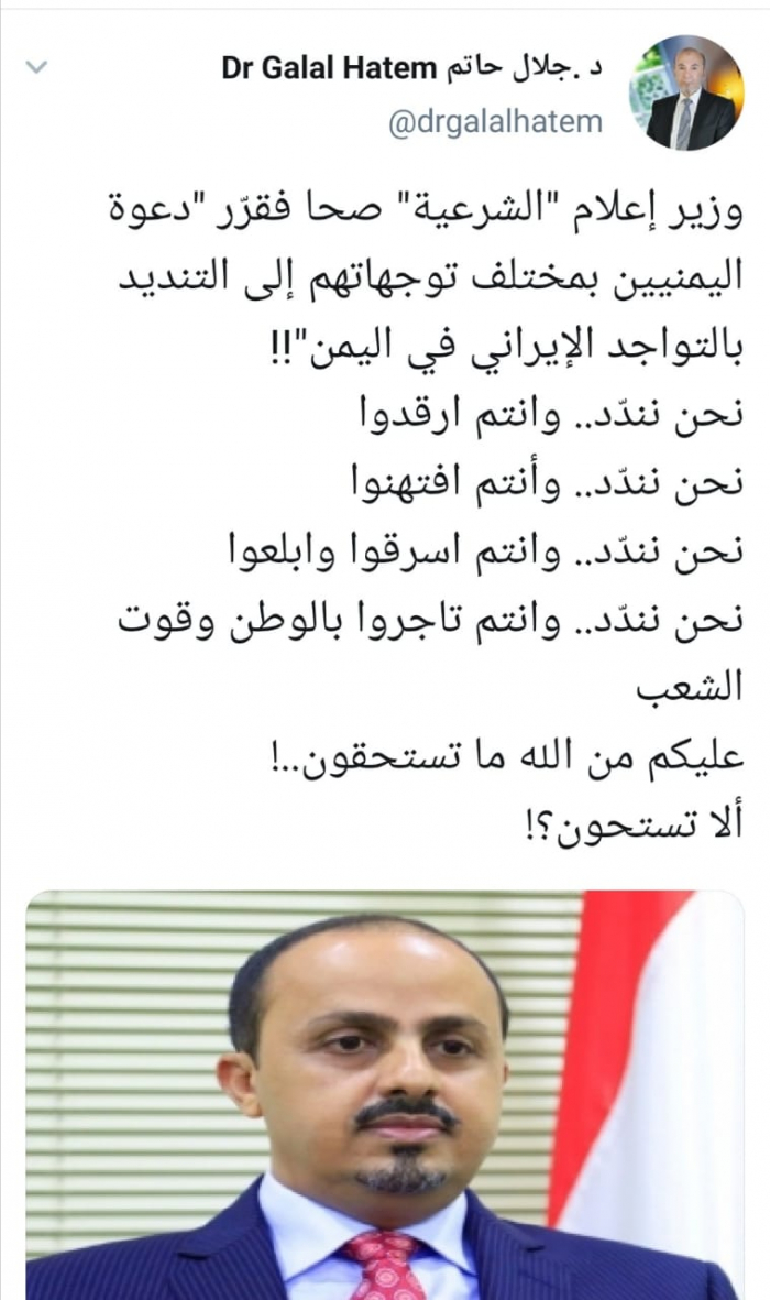 وقال حاتم في تغريدة له عبر حسابه بتويتر ورصدها "المشهد العربي": "وزير إعلام "الشرعية" صحا فقرّر "دعوة اليمنيين بمختلف توجهاتهم إلى التنديد بالتواجد الإيراني في اليمن".