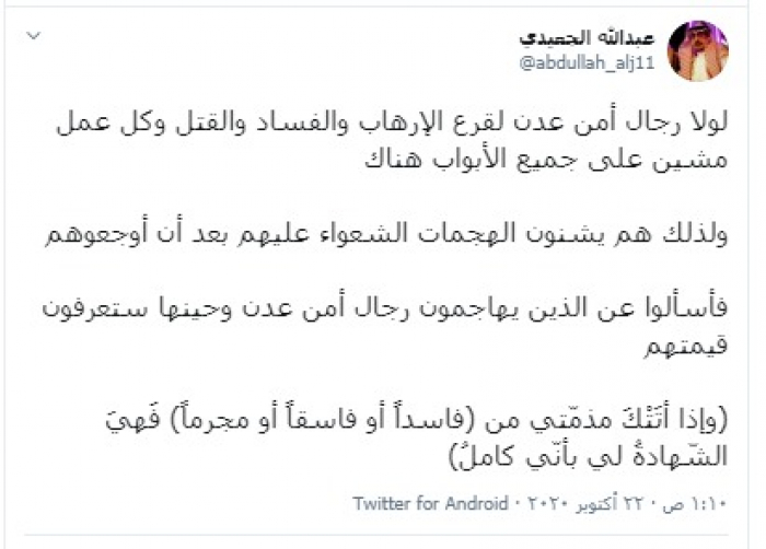 وكتب "الجعيدي" تغريدة عبر تويتر، رصدها "المشهد العربي": "لولا رجال أمن عدن لقرع الإرهاب والفساد والقتل وكل عمل مشين على جميع الأبواب هناك".