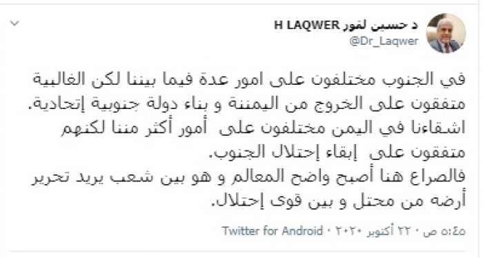 وكتب "لقور" تغريدة عبر تويتر، رصدها "المشهد العربي": "في الجنوب مختلفون على أمور عدة فيما بيننا لكن الغالبية متفقون على الخروج من اليمننة و بناء دولة جنوبية اتحادية".
