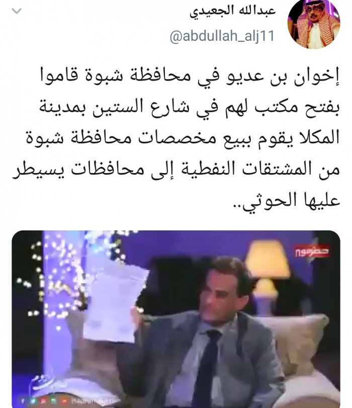 وقال الجعيدي عبر تغريدة له على "تويتر" رصدها "المشهد العربي" : "إخوان بن عديو في محافظة شبوة قاموا بفتح مكتب لهم في شارع الستين بمدينة المكلا يقوم ببيع مخصصات محافظة شبوة من المشتقات النفطية إلى محافظات يسيطر عليها الحوثي".