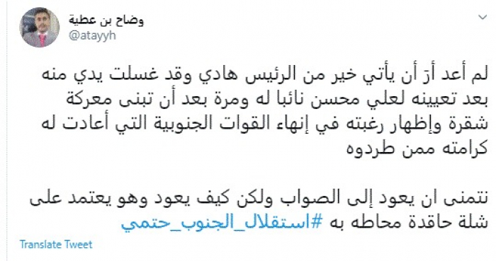 وقال في تغريدة عبر "تويتر" رصدها "المشهد العربي": "لم أعد أرَ أن يأتي خير من الرئيس هادي وقد غسلت يدي منه بعد تعيينه لعلي محسن نائبًا له ومرة بعد أن تبنى معركة شقرة وإظهار رغبته في إنهاء القوات الجنوبية التي أعادت له كرامته ممن طردوه".
