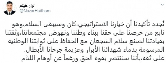 وأضاف: "وثقتنا بقيادتنا لصنع سلام الشجعان مع الحفاظ على ثوابتنا الوطنية المرسومة بدماء شهدائنا الأبرار وعزيمة جرحانا الأبطال".
