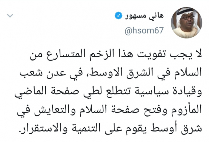 وكتب مسهور في تغريدة له على "تويتر" رصدها " المشهد العربي":" لا يجب تفويت هذا الزخم المتسارع من السلام في الشرق الأوسط في عدن شعب وقيادة سياسية تتطلع لطي صفحة الماضي المأزوم وفتح صفحة السلام والتعايش في شرق أوسط يقوم على التنمية والاستقرار".