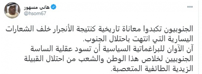 وكتب في تغريدة عبر "تويتر" رصدها "المشهد العربي": "الجنوبيون تكبدوا معاناة تاريخية كنتيجة الانجرار خلف الشعارات اليسارية التي انتهت باحتلال الجنوب".