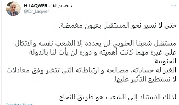وكتب في تغريدة عبر "تويتر" رصدها "المشهد العربي": "حتى لا نسير نحو المستقبل بعيون مغمضة. مستقبل شعبنا الجنوبي لن يحدده إلا الشعب نفسه والاتكال على غيره مهما كانت أهميته ودوره لن يأت لنا بالدولة الجنوبية".
