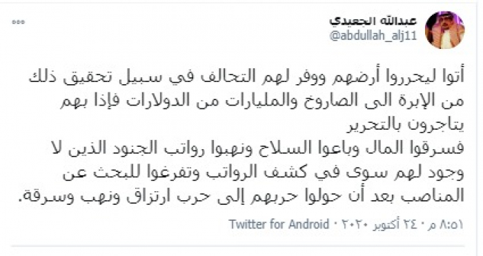 وكتب "الجعيدي" تغريدة عبر تويتر، رصدها "المشهد العربي": "أتوا ليحرروا أرضهم ووفر لهم التحالف في سبيل تحقيق ذلك من الإبرة إلى الصاروخ والمليارات من الدولارات فإذا بهم يتاجرون بالتحرير".