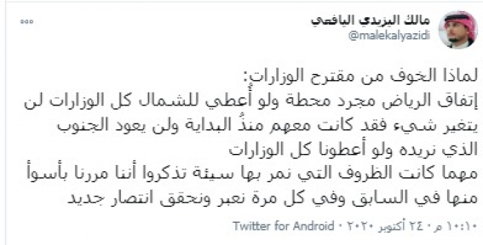 وأضاف: "اتفاق الرياض مجرد محطة ولو أُعطي للشمال كل الوزارات لن يتغير شيء فقد كانت معهم منذُ البداية ولن يعود الجنوب الذي نريده ولو أعطونا كل الوزارات".