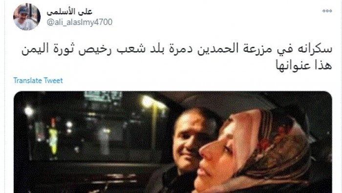 وقال في تغريدة عبر "تويتر" رصدها "المشهد العربي": "سكرانة في مزرعة الحمدين دمرت بلد شعب رخيص ثورة اليمن هذا عنوانها".