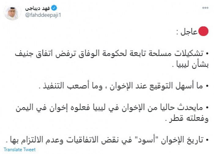 وكتب في تغريدة عبر "تويتر" رصدها "المشهد العربي": "تشكيلات مسلحة تابعة لحكومة الوفاق ترفض اتفاق جنيف بشأن ليبيا. ما أسهل التوقيع عند الإخوان ، وما أصعب التنفيذ".