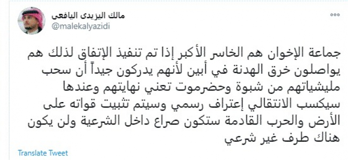 توقع الناشط السياسي مالك اليزيدي اليافعي، اليوم، اندلاع صراع شرس داخل حكومة الشرعية، مؤكدًا في الوقت ذاته أن جماعة الإخوان الإرهابية باليمن هي الخاسر الأكبر في حال تنفيذ اتفاق الرياض.