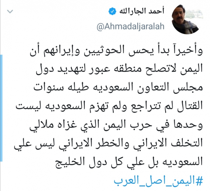 وكتب الجار الله عبر تغريدة له على " تويتر" رصدها " المشهد العربي": "وأخيرا بدأ يحس الحوثيون وإيرانهم أن اليمن لا تصلح منطقة عبور لتهديد دول مجلس التعاون".