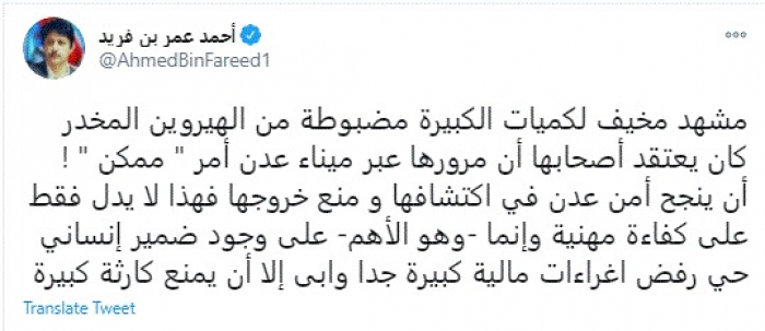منعوا كارثة كبيرة.. بن فريد يشيد بكفاءة أمن عدن في ضبط شحنة المخدرات