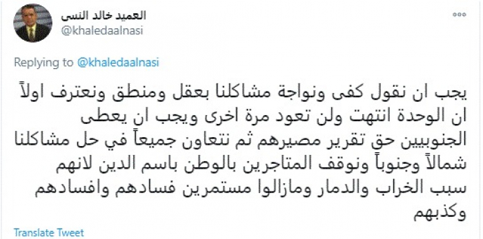 النسي: الوحدة لن تعود مرة أخرى.. ويجب إعطاء الجنوبيين حق تقرير مصيرهم
