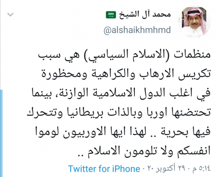 وكتب آل الشيخ في تغريدة له عبر "تويتر" رصدها "المشهد العربي": "منظمات (الإسلام السياسي) هي سبب تكريس الإرهاب والكراهية ومحظورة في أغلب الدول الاسلامية الوازنة بينما تحتضنها أوربا وبالذات بريطانيا وتتحرك فيها بحرية.