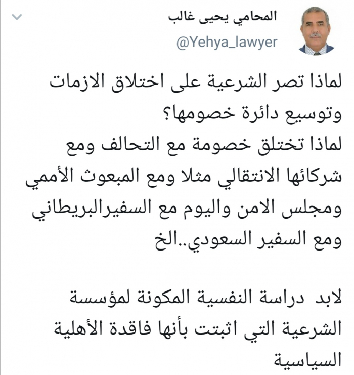 وتساءل عبر تغريدة له على "تويتر" رصدها " المشهد العربي" قائلًا: "لماذا تصر الشرعية على اختلاق الأزمات وتوسيع دائرة خصومها"؟