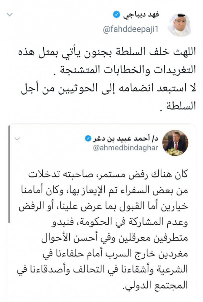 وقال ديباجي عبر تغريدة على حسابه في تويتر ورصدها "المشهد العربي": "اللهث خلف السلطة بجنون يأتي بمثل هذه التغريدات والخطابات المتشنجة لا أستبعد انضمامه إلى الحوثيين من أجل السلطة".