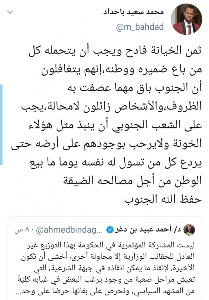 وقال باحداد في تغريدة له عبر حسابه بتويتر ورصدها "المشهد العربي": " ثمن الخيانة فادح ويجب أن يتحمله كل من باع ضميره ووطنه، إنهم يتغافلون أن الجنوب باق مهما عصفت به الظروف، والأشخاص زائلون لا محالة".
