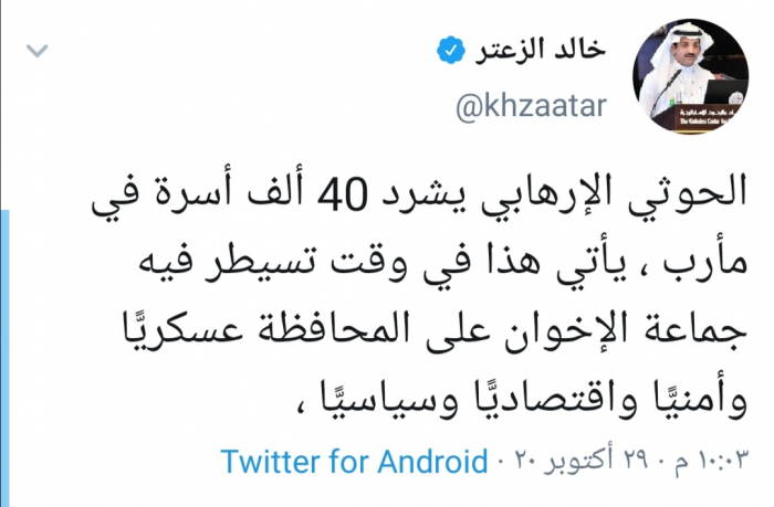 وقال الزعتر عبر تغريدة له على "تويتر" رصدها "المشهد العربي": "الحوثي الإرهابي يشرد 40 ألف أسرة في مأرب ، يأتي هذا في وقت تسيطر فيه جماعة الإخوان على المحافظة عسكريًّا وأمنيًّا واقتصاديًّا وسياسيًّا".