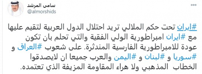 وقال في تغريدة عبر "تويتر" رصدها "المشهد العربي": "إيران تحت حكم الملالي تريد احتلال الدول العربية لتقيم عليها مع إيران إمبراطورية الولي الفقية والتي تحلم بأن تكون عودة للإمبراطورية الفارسية المندثرة".