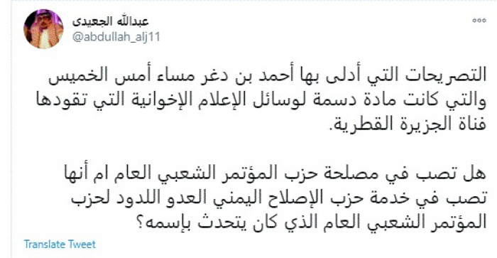 وقال في تغريدة عبر "تويتر" رصدها "المشهد العربي": "التصريحات التي أدلى بها أحمد بن دغر مساء أمس الخميس والتي كانت مادة دسمة لوسائل الإعلام الإخوانية التي تقودها فناة الجزيرة القطرية".