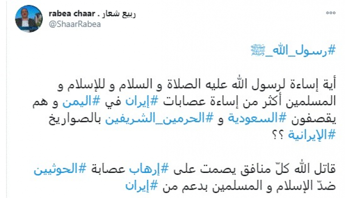 وقال في تغريدة عبر "تويتر" رصدها "المشهد العربي": "رسول الله ﷺ أية إساءة لرسول الله عليه الصلاة والسلام وللإسلام والمسلمين أكثر من إساءة عصابات إيران في اليمن وهم يقصفون السعودية والحرمين الشريفين بالصواريخ الإيرانية؟".
