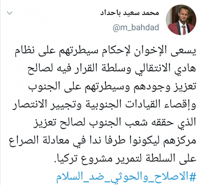 وقال باحداد في تغريدة له عبر حسابه بتويتر ورصدها "المشهد العربي": " يسعى الإخوان لإحكام سيطرتهم على نظام هادي والانتقالي وسلطة القرار فيه لصالح تعزيز وجودهم وسيطرتهم على الجنوب وإقصاء القيادات الجنوبية وتجيير الانتصار الذي حققه شعب الجنوب لصالح تعزيز مركزهم".