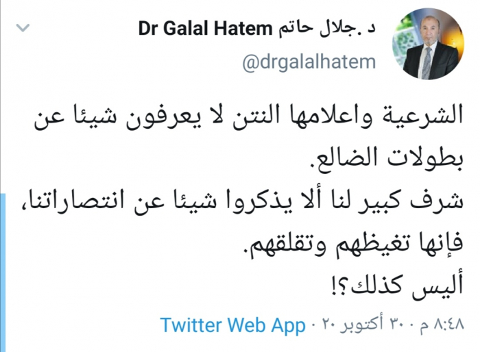 وأضاف حاتم:" شرف كبير لنا ألا يذكروا شيئا عن انتصاراتنا، فإنها تغيظهم وتقلقهم. أليس كذلك"؟!