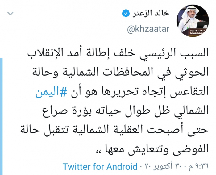 وقال الزعتر عبر تغريدة له على "تويتر" رصدها "المشهد العربي": "السبب الرئيسي خلف إطالة أمد الانقلاب الحوثي في محافظات الشمال وحالة التقاعس اتجاه تحريرها هو أن اليمن الشمالي ظل طوال حياته بؤرة صراع حتى أصبحت العقلية الشمالية تتقبل حالة الفوضى وتتعايش معها".