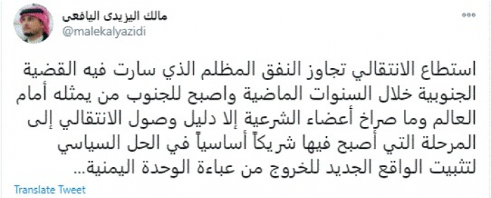 وكتب في تغريدة عبر "تويتر" رصدها "المشهد العربي": "استطاع الانتقالي تجاوز النفق المظلم الذي سارت فيه القضية الجنوبية خلال السنوات الماضية وأصبح للجنوب من يمثله أمام العالم".