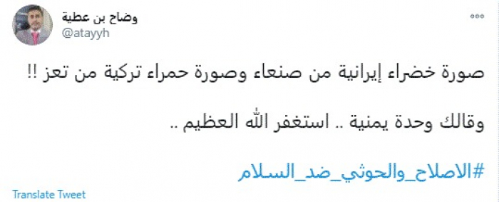 وقال في تغريدة عبر "تويتر" رصدها "المشهد العربي": "صورة خضراء إيرانية من صنعاء وصورة حمراء تركية من تعز! وقالك وحدة يمنية.. استغفر الله العظيم".