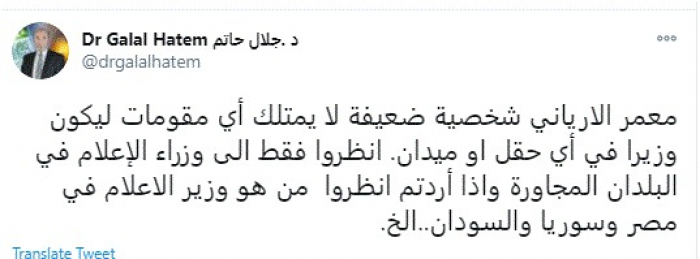 وقال في تغريدة عبر "تويتر" رصدها "المشهد العربي": "معمر الإرياني شخصية ضعيفة لا يمتلك أي مقومات ليكون وزيرًا في أي حقل أو ميدان".