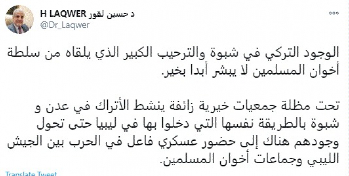 وقال في تغريدة عبر "تويتر" رصدها "المشهد العربي": "الوجود التركي في شبوة والترحيب الكبير الذي يلقاه من سلطة إخوان المسلمين لا يبشر أبدًا بخير".