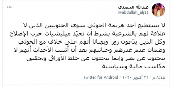 وكتب " الجعيدي" تغريدة عبر تويتر، رصدها "المشهد العربي": "لا يستطيع أحد هزيمة الحوثي سوى الجنوبيين الذين لا علاقة لهم بالشرعية بشرط أن تحيّد مليشيات حزب الإصلاح وكل الذين يدّعون زورا وبهتانا أنهم على خلاف مع الحوثي وضمان عدم غدرهم وخيانتهم، بعد أن أثبتت الأحداث أنهم لا يبحثون عن نصر وإنما يبحثون عن خلط الأوراق وتحقيق مكاسب مالية وسياسية".