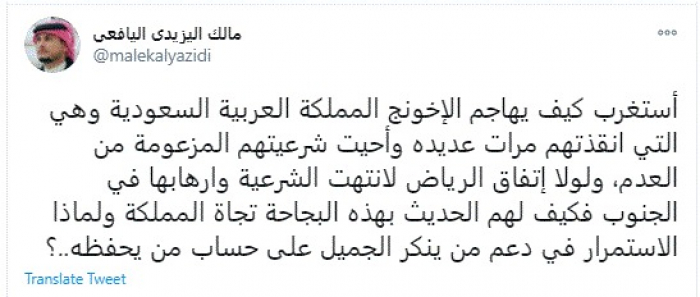 وقال في تغريدة عبر "تويتر" رصدها "المشهد العربي": "استغرب كيف يهاجم الإخونج المملكة العربية السعودية وهي التي أنقذتهم مرات عديدة وأحيت شرعيتهم المزعومة من العدم".