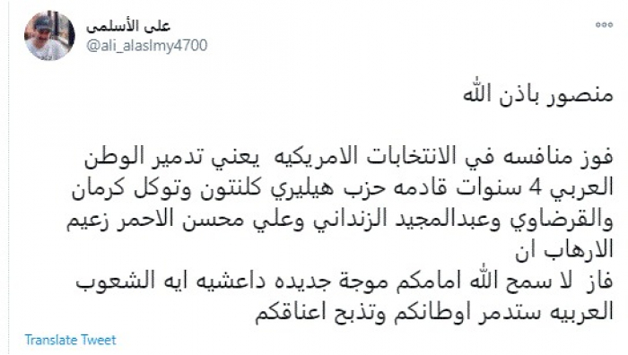 وقال في تغريدة عبر "تويتر" رصدها "المشهد العربي": "منصور بإذن الله فوز منافسه في الانتخابات الأمريكية يعني تدمير الوطن العربي 4 سنوات قادمة حزب هيلاري كلينتون وتوكل كرمان والقرضاوي وعبدالمجيد الزنداني وعلي محسن الأحمر زعيم الإرهاب إن فاز لا سمح الله أمامكم موجة جديدة داعشية أي الشعوب العربية ستدمر أوطانكم وتذبح أعناقكم".