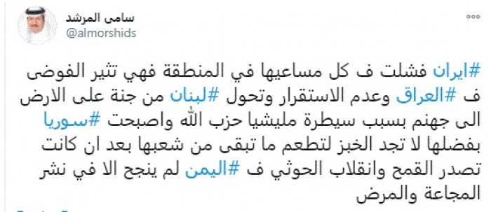 وكتب في تغريدة عبر "تويتر" رصدها "المشهد العربي": "إيران فشلت في كل مساعيها في المنطقة فهي تثير الفوضى في العراق وعدم الاستقرار".