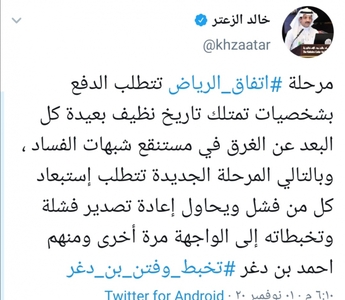 وأكد الزعتر عبر تغريدة له على "تويتر" رصدها "المشهد العربي"، أن "المرحلة الجديدة تتطلب استبعاد كل من فشل ويحاول إعادة تصدير فشله وتخبطاته إلى الواجهة مرة أخرى ومنهم أحمد بن دغر".