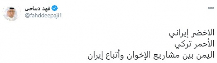 وكتب في تغريدة عبر "تويتر" رصدها "المشهد العربي": "الأخضر إيراني. الأحمر تركي. اليمن بين مشاريع الإخوان وأتباع إيران".