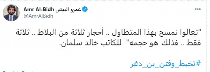 وكتب في تغريدة عبر "تويتر" رصدها "المشهد العربي": "تعالوا نمسح بهذا المتطاول .. أحجار ثلاثة من البلاط .. ثلاثة فقط .. فذلك هو حجمه للكاتب خالد سلمان. تخبط وفتن بن دغر".