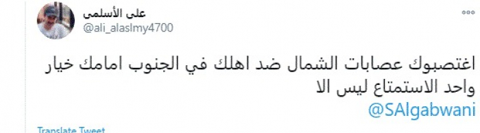 وقال في تغريدة عبر "تويتر" رصدها "المشهد العربي": "اغتصبوك عصابات الشمال ضد أهلك في الجنوب أمامك خيار واحد الاستمتاع ليس إلا".